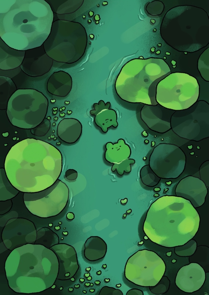 작품 설명 : 프로와 로그가 시원한 연못 위에 자유롭게 둥둥 떠다니며 느긋하고 여유로운 하루를 보내고 있는 그림이다.