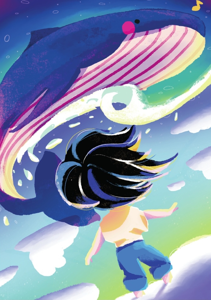 작품 설명 : 세상을 거꾸로 보면 어떨까 하여 그린 그림이며 드넓은 바다를 구경하다가 즐거워하는 고래를 마주쳐 행복한 시간을 담은 그림이다.