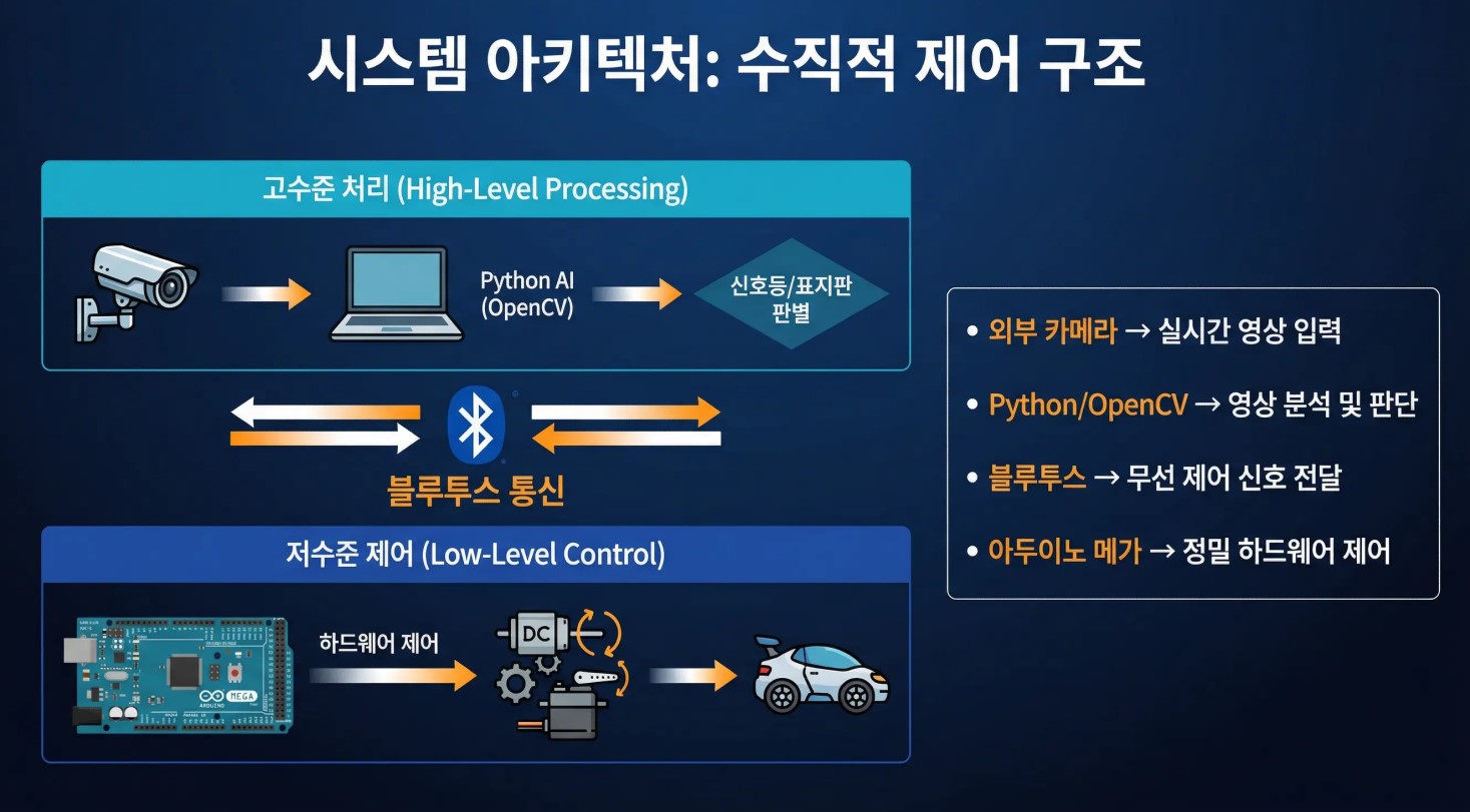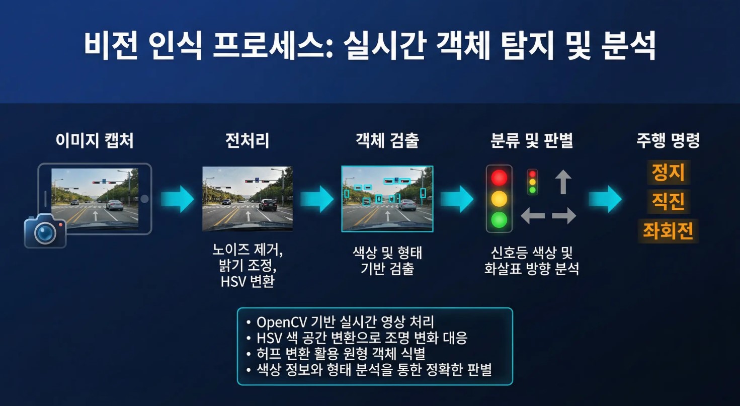 사람이 운전할 때 눈으로 신호등을 보고, 차선을 따라가고, 뒤에 뭔가 있으면 멈추죠? 이 프로젝트는 그 과정을 컴퓨터와 센서로 자동화한 것입니다.