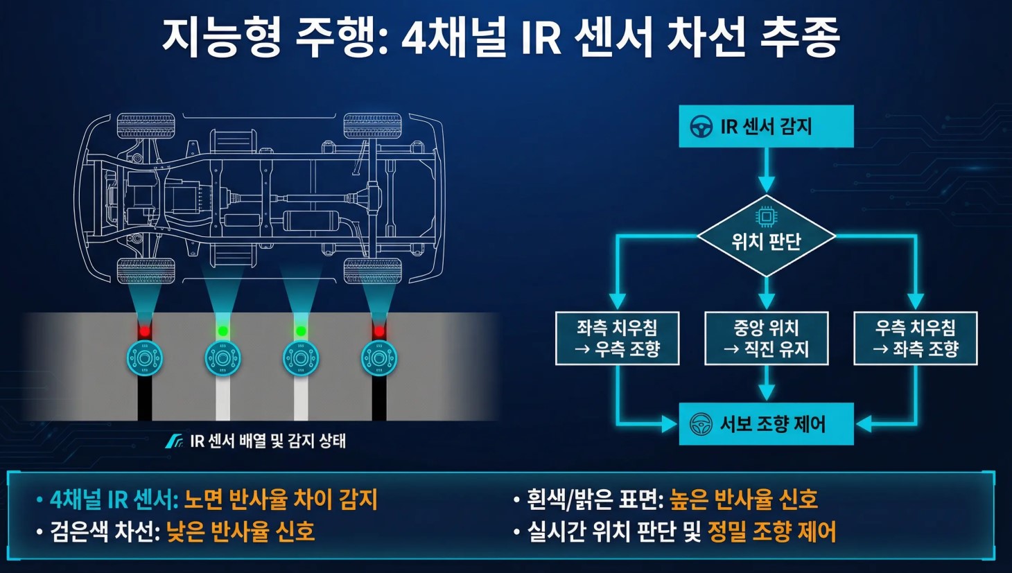차선을 따라가게 하기 위해서는 IR 센서(적외선 센서)를 활용하였고, 차 뒤쪽에 초음파 센서를 통해 장애물을 감지할 수 있게 설계하였습니다.