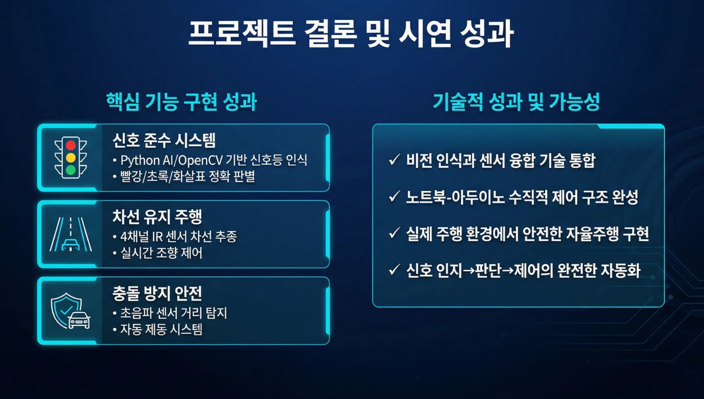 이번 프로젝트는 신호등을 인식해 신호를 준수할 수 있게 하는 신호 준수 기능, 차선 밖으로 나가지 않고 방향을 잡게 하는 차선 유지 기능, 장애물이 가까워지면 멈추는 충돌 방지 기능을 구현했다는 점에서 의미가 있습니다.