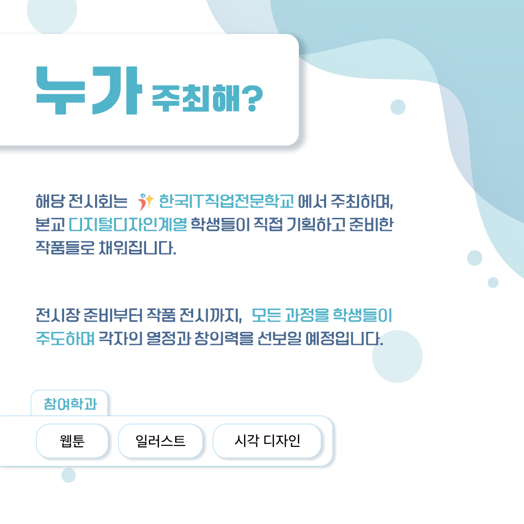 전시장 준비부터 기획, 작품 제작, 전시, 홍보까지 모든 과정을 학생들이 주도하며 각자의 열정과 개성, 창의력을 선보일 예정입니다.