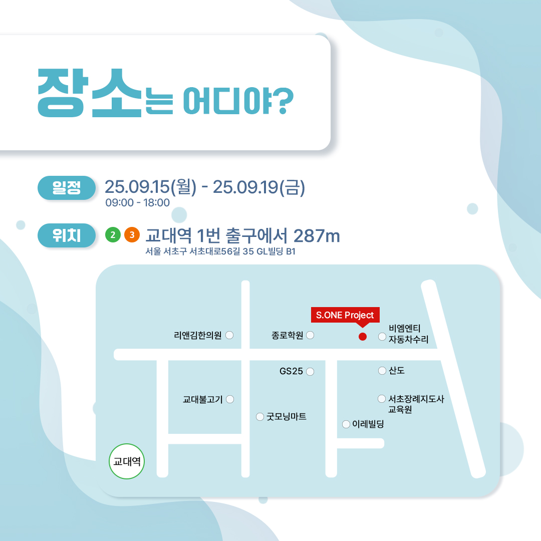 장소 : 서울 서초구 서초대로56길 35 GL빌딩 B1층 S.ONE Project
