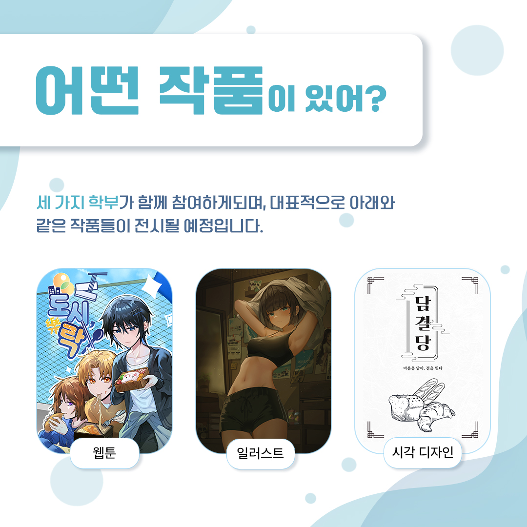 ‘한가람’ 전시회는 디지털디자인계열에 소속한 시각디자인·웹툰애니·일러스트 전공이 모두 참여해 풍성한 전시회가 될 것 같아 기대가 되는데요.