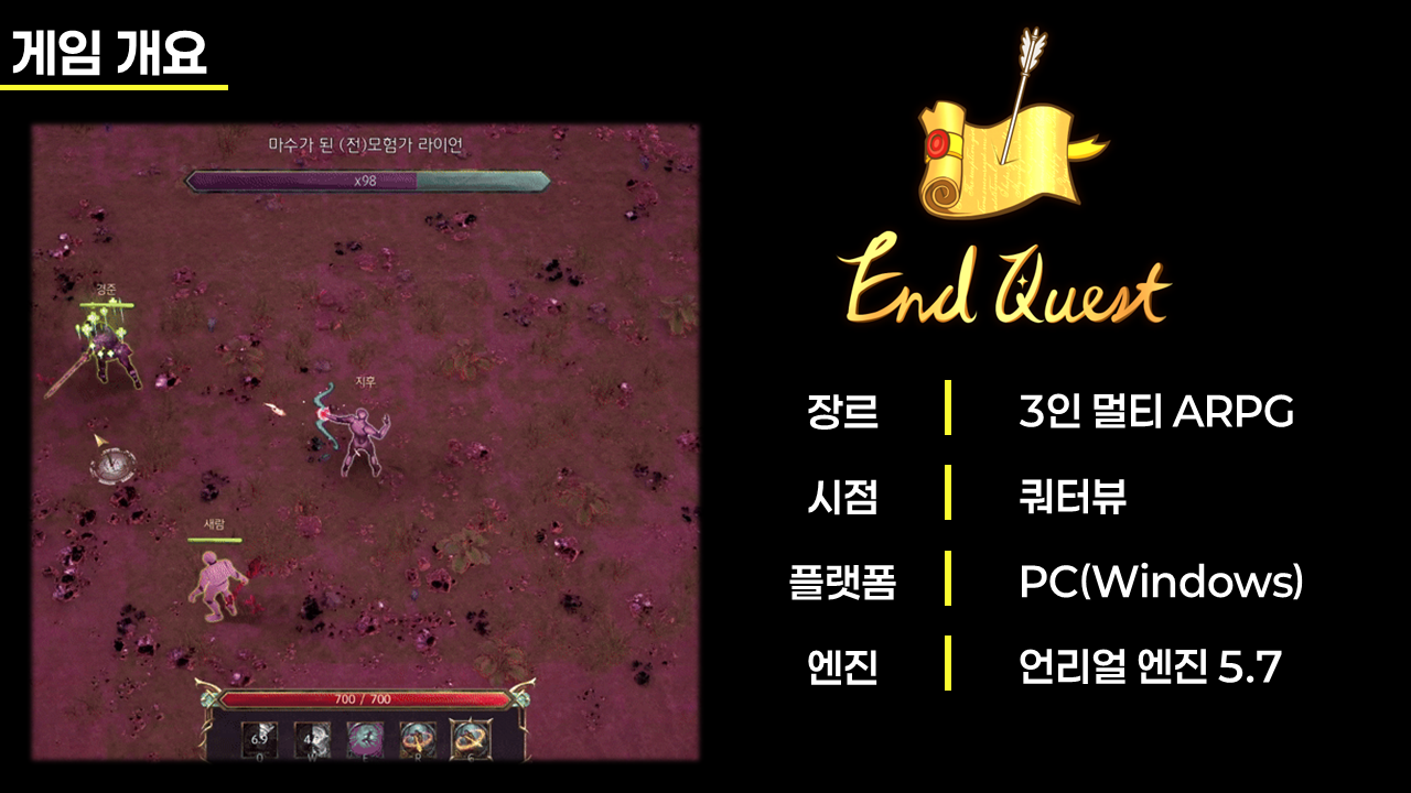 이번 프로젝트는 기획 5명, 그래픽 3명으로 구성된 총 8명의 팀원들이 협업하여 완성한 결과물로, 3인 멀티플레이 ARPG 게임을 주제로 제작되었습니다.
