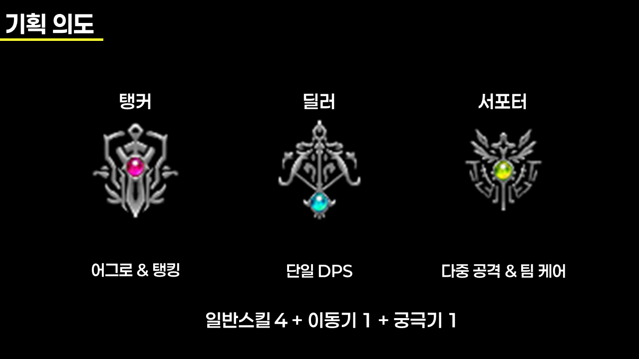 특히 역할 분담의 재미를 극대화하기 위해 캐릭터를 탱커, 딜러, 서포터로 나누고, 각 역할에 맞는 스킬 구조를 설계했습니다.